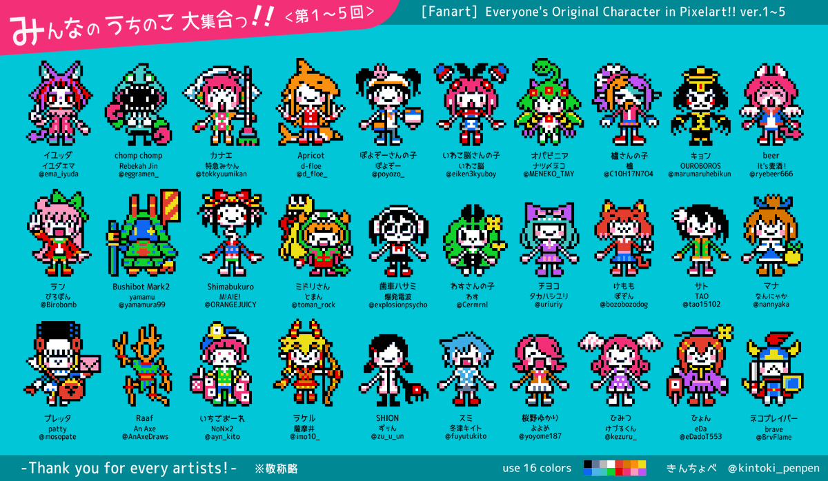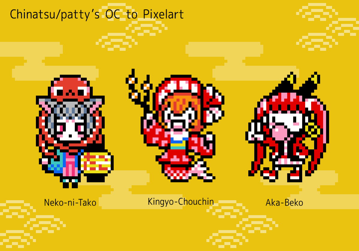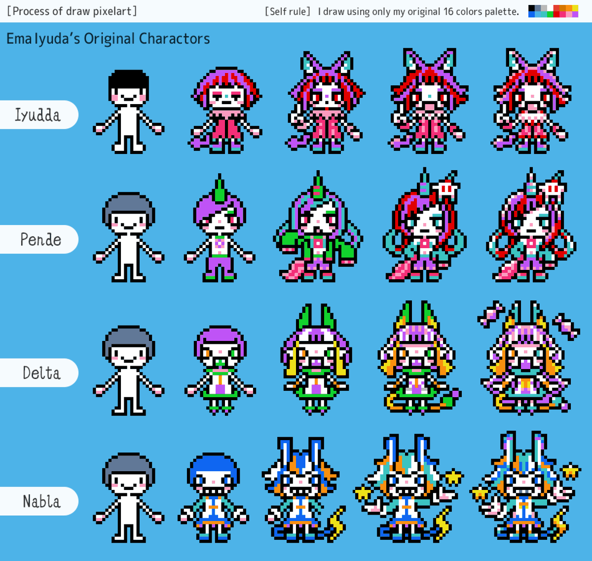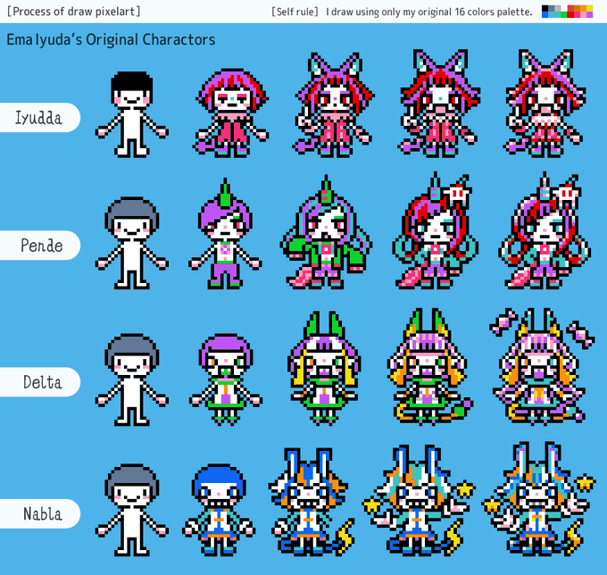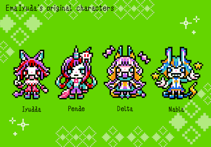 イユダエマさん(@ema_iyuda)のメイン4キャラをドット絵でっ! 「イユッダ」「ペンデ」「デルタ」「ナブラ」 Draw Ema Iyuda's original characters with pixelart! "Iyudda", "Pende", "Delta", "Nabla" #fanart#pixelart#ドット絵