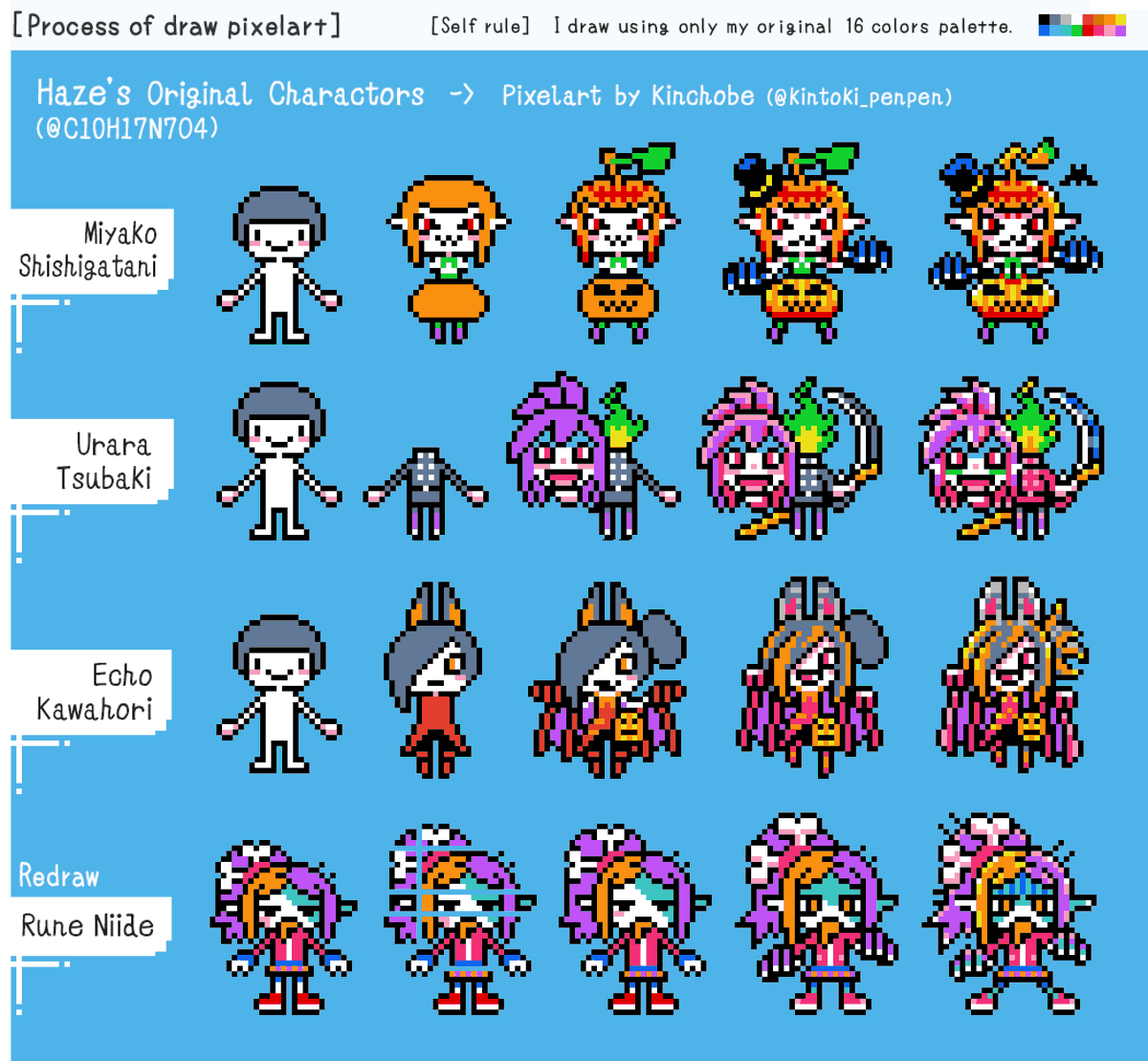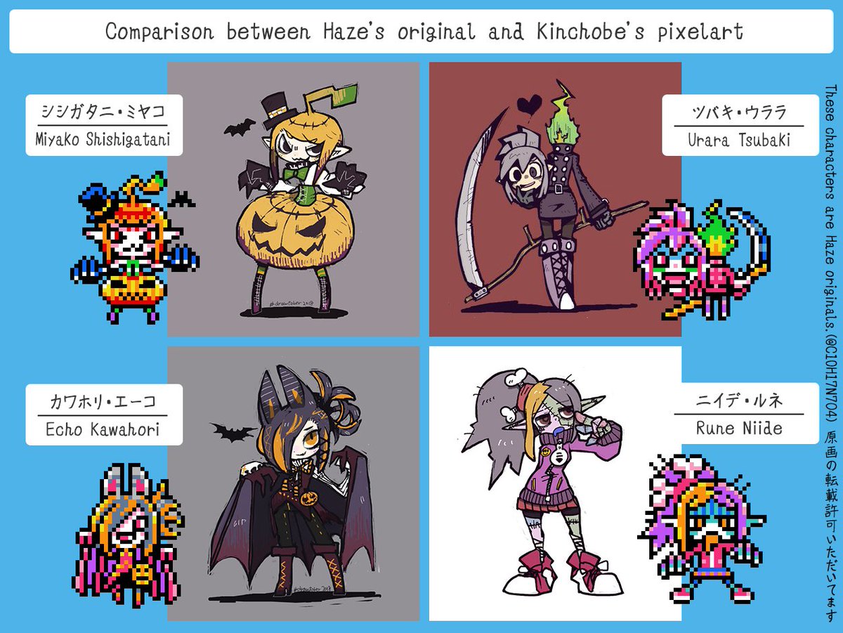 @C10H17N7O4 Process of draw Haze's original characters with pixel. and Comparison between Haze’s original and Kinchobe’s pixelart. Haze(@C10H17N7O4) #fanart#pixelart#ドット絵