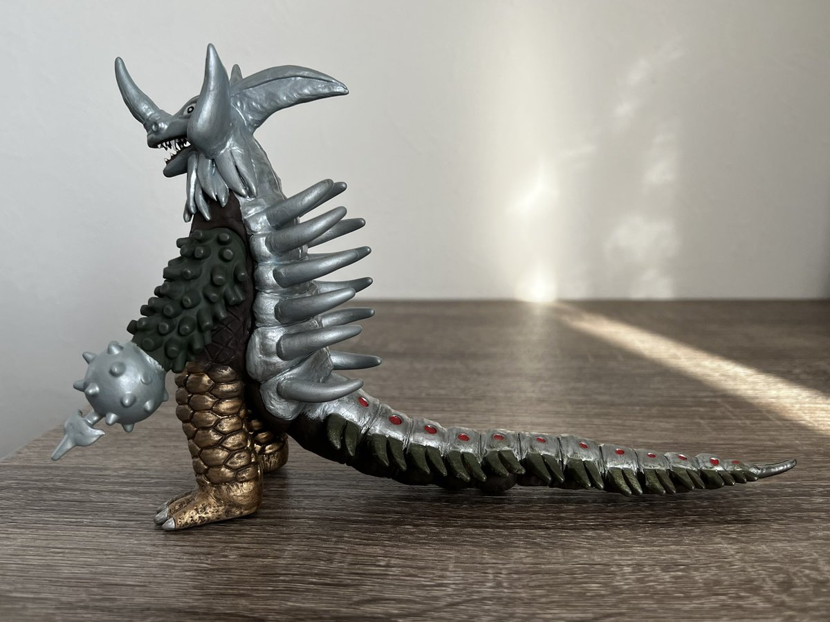 「ウルトラ怪獣シリーズ 暴君怪獣 タイラント」 頭部は旧ソフビのタイラント。 ツノを伸ばし、耳、トサカ、鼻の形状を変更。のぞき穴も追加。 腕も旧ソフビからだが鎌の一部と鉄球に付いた錨は現行タイラントから。 #造って遊ぼ #ウルトラフィギュア改造同好会 #ウルトラ怪獣