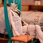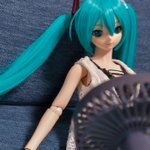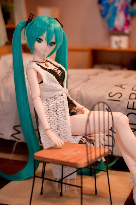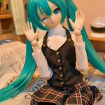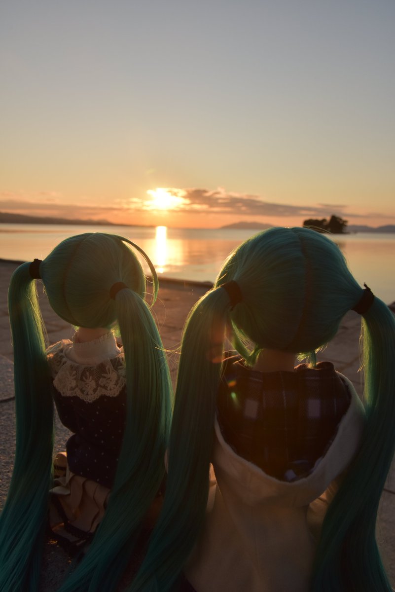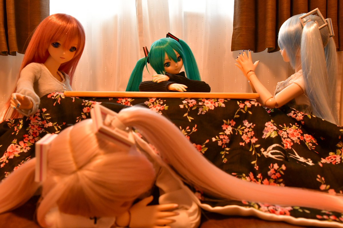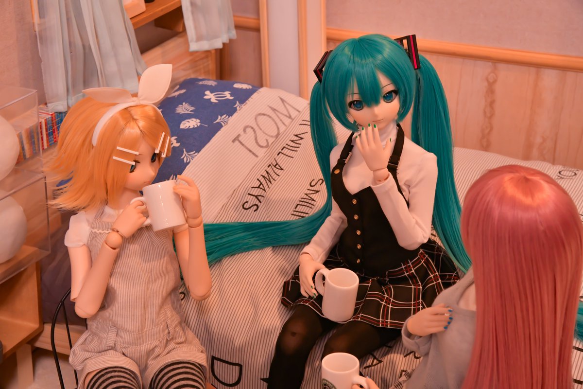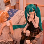 #深夜の初音ミク撮影60分一本勝負 1/7 お題「なかよし」遅刻💦 なかよく添い寝する次女ミクさんと三女ミクさん それを見守る長女ミクさん 長女ミクさん「なかよく寝てますね」 私「私とも添い。。。」 長女ミクさん「マスター?😑」