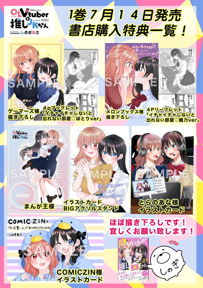 #OLVTuberと推しJKちゃん 7月14日(金)発売 「OLVTuberと推しJKちゃん」の 1巻が発売されます🎉✨各書店様の特典一覧です!!ご参考下さいませ🙇♂️✨ メロンさんゲーマーズさんの描き下ろし4p漫画は雛乃、ほとりver.で違うイチャイチャしないと出れない部屋となっております💓✨