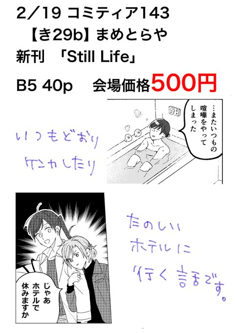 コミティア143【き29b】まめとらや 新刊「Still Life」 40p/500円(会場価格) ・スケブ等はお受けできません。 ・都合により14時頃にはぼちぼち撤収すると思います。 (通販)メロンブックス→ melonbooks.co.jp/detail/detail.… とらのあな→ecs.toranoana.jp/tora/ec/item/0… よろしくどうぞ~