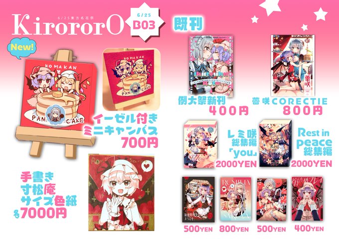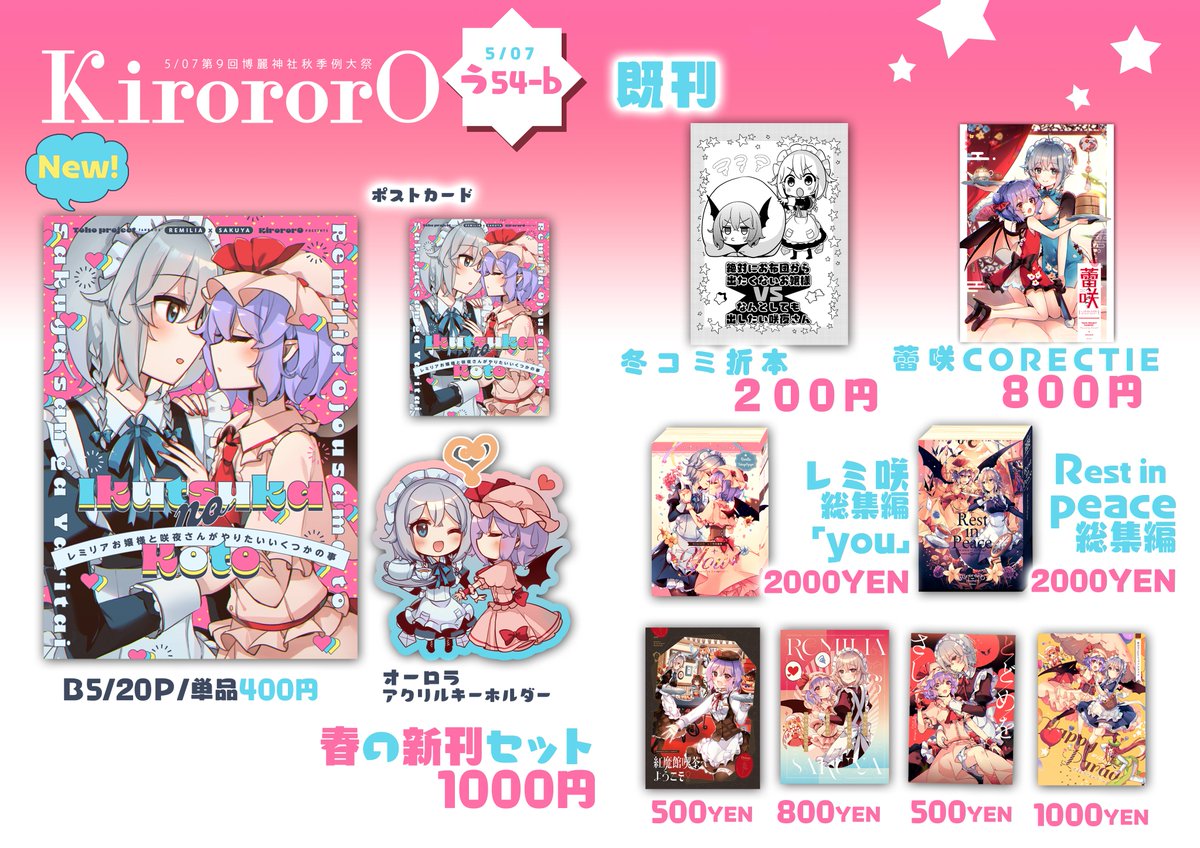 #例大祭20 新刊サンプル&お品書きです★ 「レミリアお嬢様と咲夜さんがやりたいいくつかの事」 B5/20P/イチャラブレミ咲短編まとめです 新刊の他にアクキー付きセットもあります! 例大祭☞う54b KirororO 【メロン】melonbooks.co.jp/detail/detail.… 【Booth】kirororo.booth.pm/items/4713265