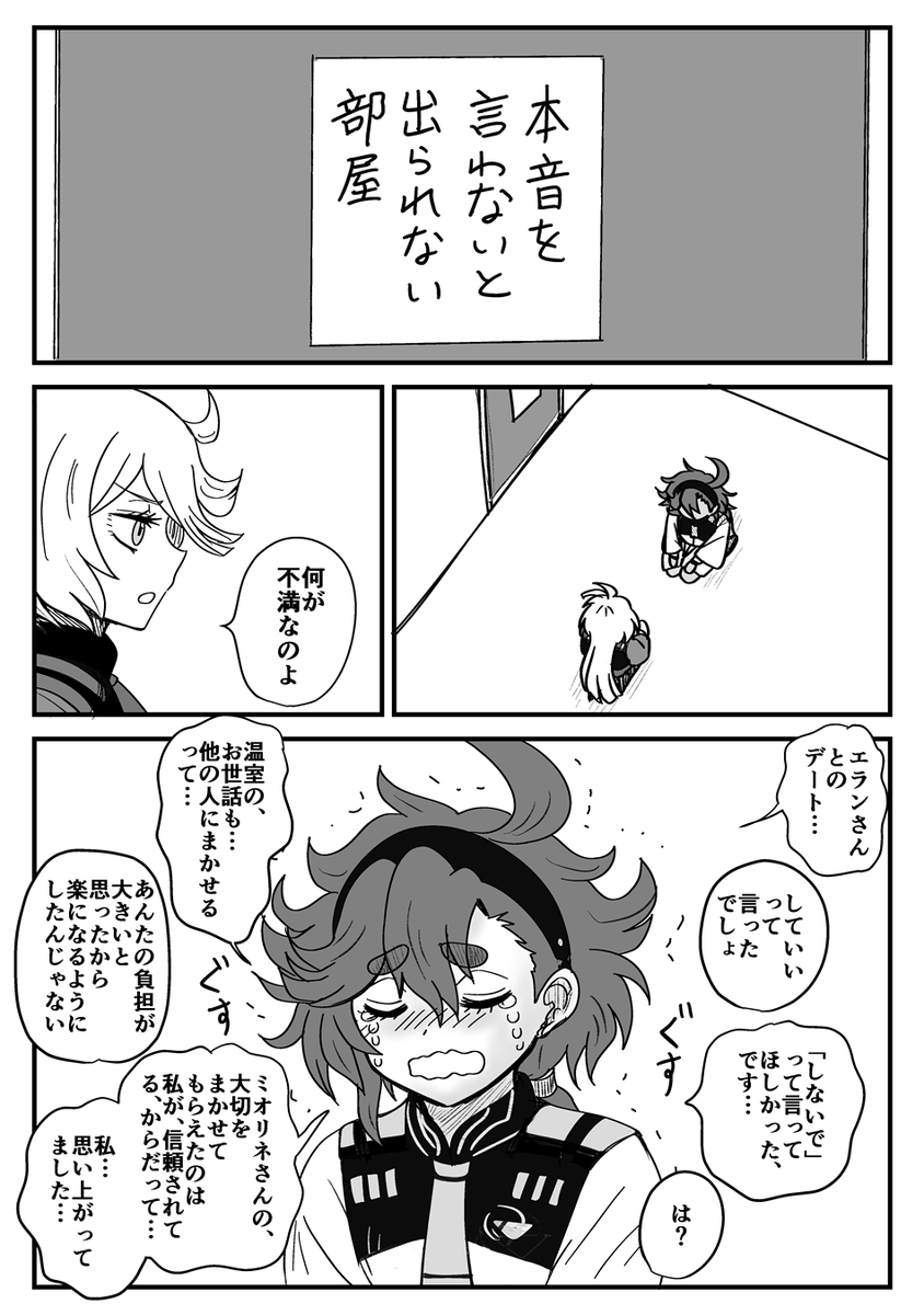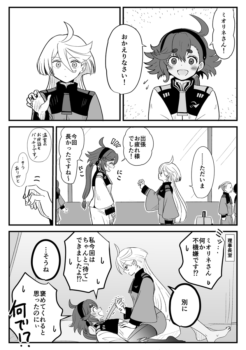 ミオリネさんは人目があるとデレてくれないけど二人きりになるとめっちゃ甘えたがるタイプだと良いと思いますねというスレミオ漫画