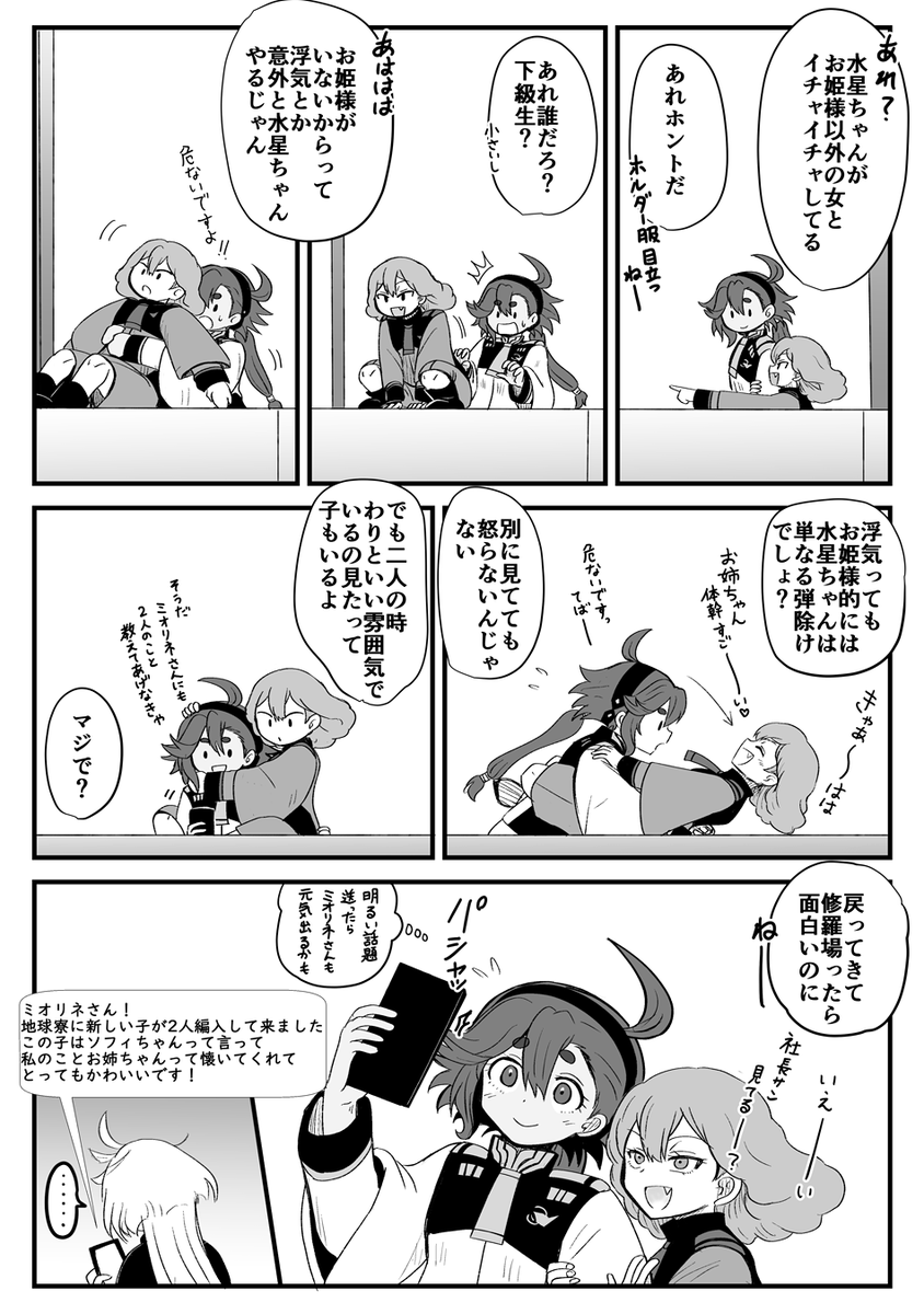 スレミオ漫画 人前でひっつこうとすると拒否するけど触れようとしてこなかったらこないで面白くないミオリネさん