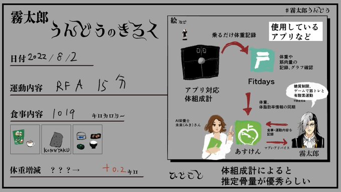 2 6 31日目の記録。 かなり体調不良で調理する元気もなかったのでお昼がこんにゃくだけになってしまった。よくないね。 夜はサバ缶や玄米を食べた。運動は15分。 今日は使ってるアプリについて図を描いてみたよ。 使用しているのはあすけん、Fitdays。手軽にデータが残せるよ #霧太郎うんどう #ダイエット 22/08/02 23:12