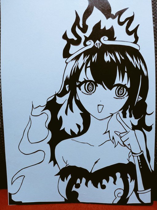 1日に2枚一気に作ってしまった! 最近イチオシVtuberの九条林檎様の切り絵です。 林檎様の瞳がすごい好きなので気合い入れて切りました。 麗しかろー? #九条林檎 #RINGO_art #Vtuber #切り絵 #切り絵アート