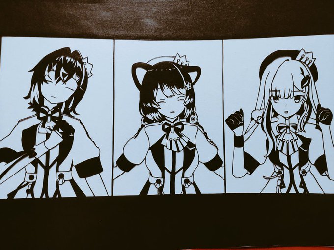 4 37 完成! いつものサイズに3人詰めたら、そりゃ一人ひとりは細かくなるよね! そんなわけで新作はさんばかの3人です。ライブめっちゃ良かった! #切り絵 #さんばか3周年 #ヘル絵スタ #絵ンジュ #いぬいらすと #にじさんじ #さんばか 22/04/01 14:38
