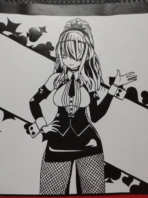 パタちが完成したよ〜。模様をトランプマークで合わせてみた。網タイツが一番大変だったけどやりきったぜ! パタ姐、新衣装も可愛いし3Dの可愛さがやばかったんだよね〜 #レイン・パターソン #レインの依頼書 #切り絵 #切り絵アート