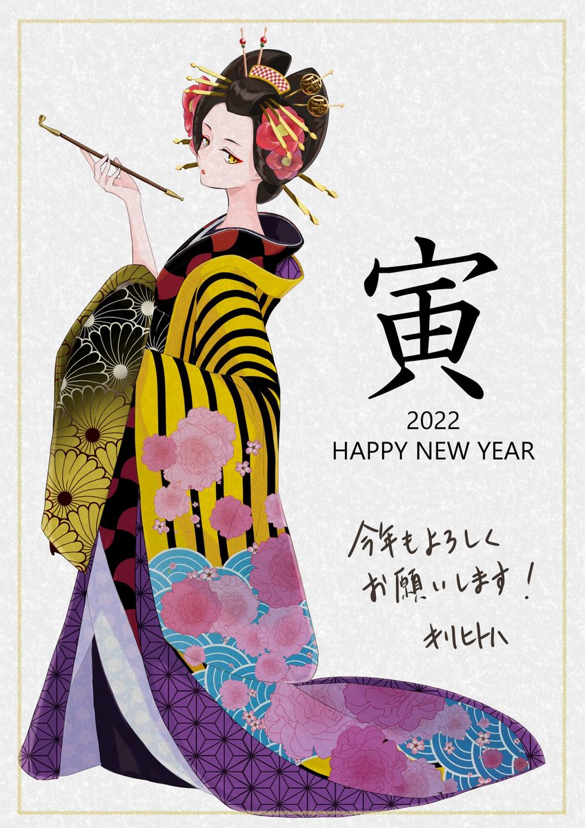 10 48 あけましておめでとうございます! 虎をモチーフにした花魁を描きましたー #HappyNewYear2022 #お正月イラスト #年賀状イラスト 22/01/01 00:02