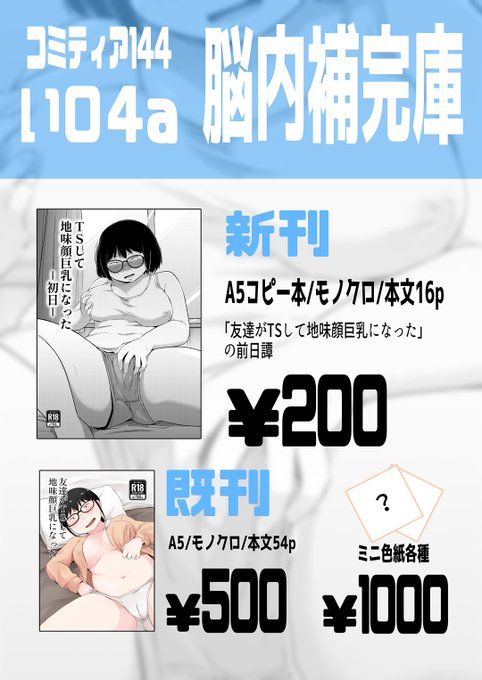 5/5のCOMITIA144のお品書きです。 新刊のコピー本、既刊とミニ色紙を持って参戦します。 【東3 い04a】でお待ちしております。 よろしくおねがいします。 #コミティア144 #COMITIA144