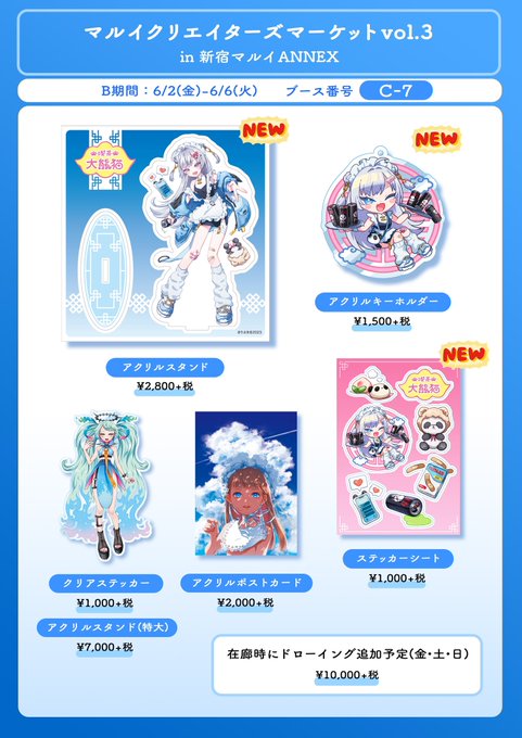 📢おしらせ📢 6月2日(金)から参加するマルイクリエイターズマーケットのお品書きができました👏🏻 ドローイングの追加情報はTwitterで随時お知らせします(在廊予定は金、土、日) ※サインは今回販売しているものに限ります acgateway.com/ex_mcm3/ #MCM3