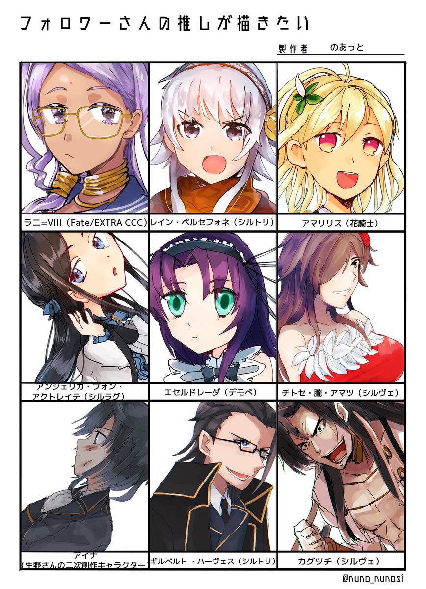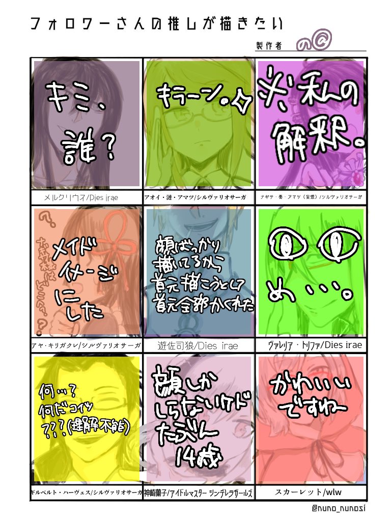 ということで今年の描き納めです。去年と同じで今年出会った子メインで。2021年お疲れ様でした! 左から玉藻(EX)/ひまり/桜(sn)/エルルゥ/有村雛絵/こずぴぃ/水無/モー子です