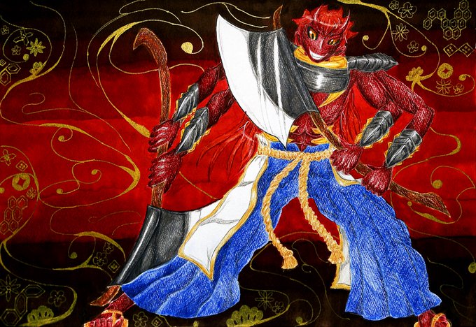 #色鉛筆 #コピック #ColorPallet企画_Red展 【双斧の蛮鬼】 いつもありがとうございます! 今回も参加させていただきます! 今回は和×人外で自分なりの【赤】を表現してみました!😊