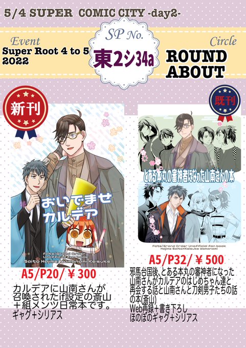 5/4るーしこ内斎山プチ「一南去ってもまた一南2」のお品書きです。 カルデアにやまなみさんが召喚されたif設定の斎山イチャイチャほのぼのギャグ新刊と、審神者やまなみさん既刊(再販しました)です。 よろしくお願いします! 新刊サンプルはリプツリーに繋げます。 pixiv.net/artworks/98033…