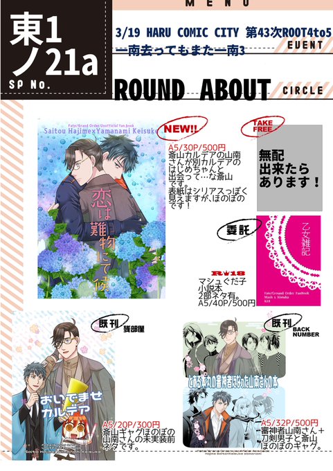 3/19春コミ 一南去ってもまた一南3のお品書きです! 東1ホールソ21a ROUND ABOUT 斎山新刊あります。 無配漫画ペーパー作れたら…。 うに様のマシュぐだ子小説本(pixiv.net/artworks/10627…)も委託させて頂きます。 どうぞよろしくお願いします🤲