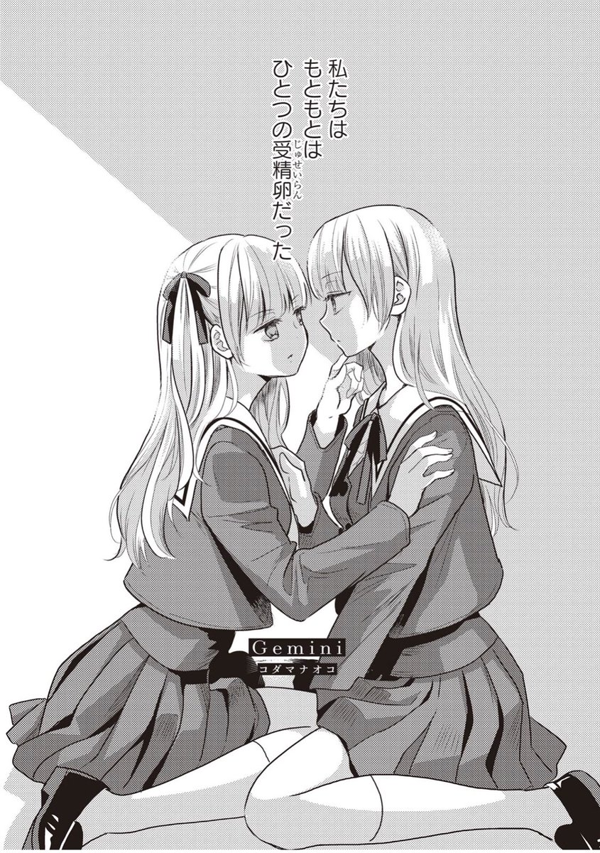しょっちゅう妊娠や出産のネタを素材に使うコダマナオコ先生(@powder705),今回の双子百合<Gemini>ではとうとう1pから"受精卵"と言い出した😇 #コダマナオコ #百合漫画