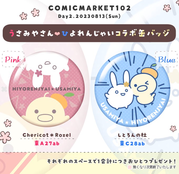 75 159 【C102ノベルティ】柚子奈ひよちゃん(@yuzuna_hiyo)とコラボで缶バッチつくりました!うれしい!お互いのスペースで1会計につき1つもらえます!ぜひ集めてください~~よろしくお願いします! 23/08/08 20:00