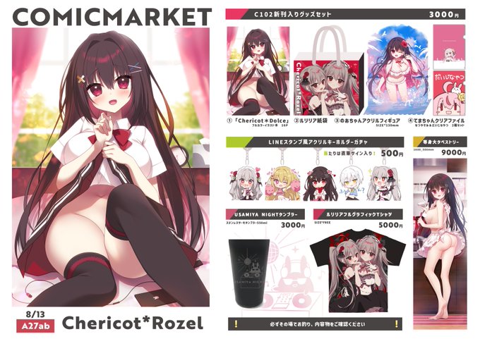 C102のお品書きです!お待たせしました! 8/13 東1ホール A27ab Chericot*Rozelです🫶よろしくお願いします~
