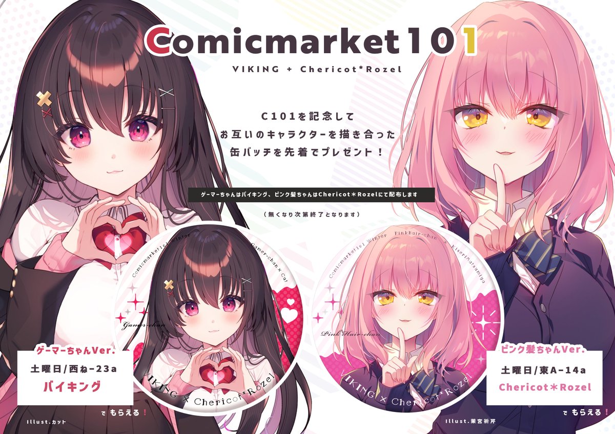 【🔸C101先着配布🔸】 【🔸バイキング×Chericot*Rozel🔸】 C101で先着で1会計につき1つ缶バッチを配布します!こちらはカットさん(@umeboshi10191 )とのコラボ仕様となっておりまして、お互いのキャラを描き合った缶バッチとなります。Chericot*Rozelではピンク髪ちゃんVerを配布予定です!
