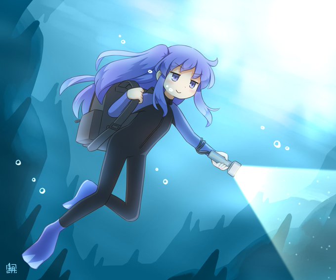 Skeb依頼絵、ウェットスーツで水中洞窟を探索するミナヅキさん。 行商人を名乗りつつトレジャーハントもしていく。