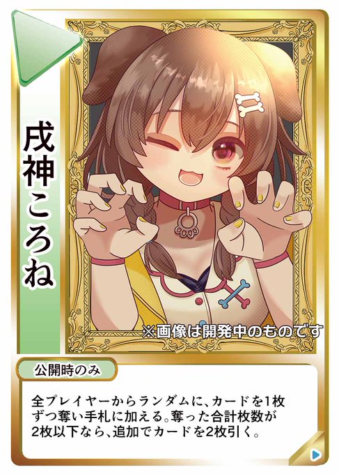 新作ボードゲーム、ホロメーカーのコラボカード「戌神ころね」です! 本ゲームでは貴重なハンデス要員となっております! #できたてころね #ホロメーカー