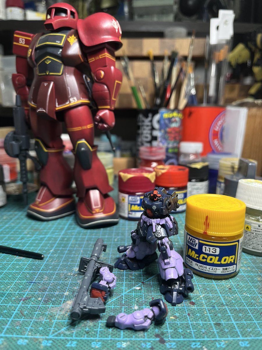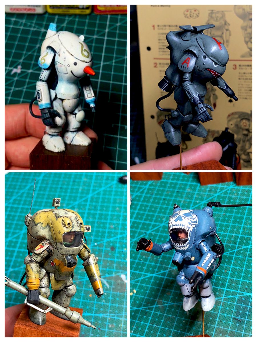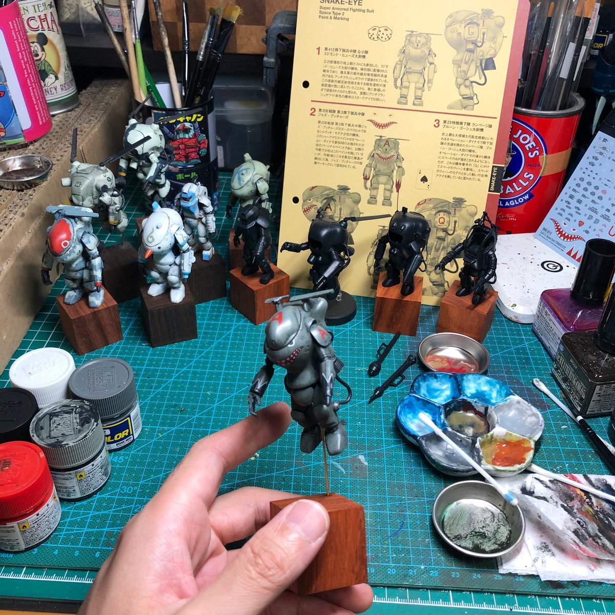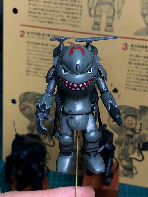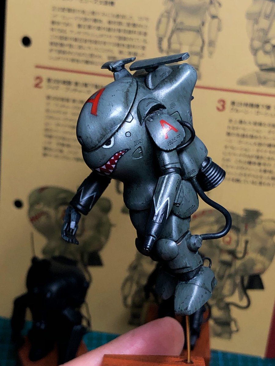 スネークアイ、完成しました! いぶし銀なグレー単色シャークマウス。マークは全てラッカー塗料で手描きしてます。 赤いA、ちょっと彩度が高すぎたかなぁ。もう少しくすむと思ったのだけれども。🤔 机の上がガチャーネンだらけになってきました💧 #マシーネンクリーガー