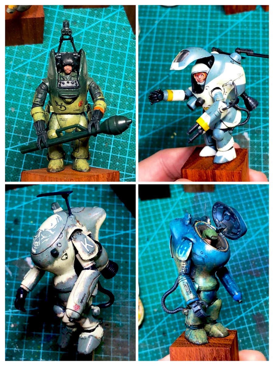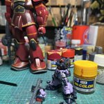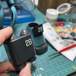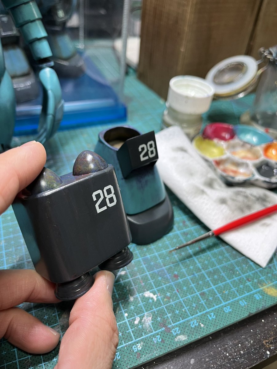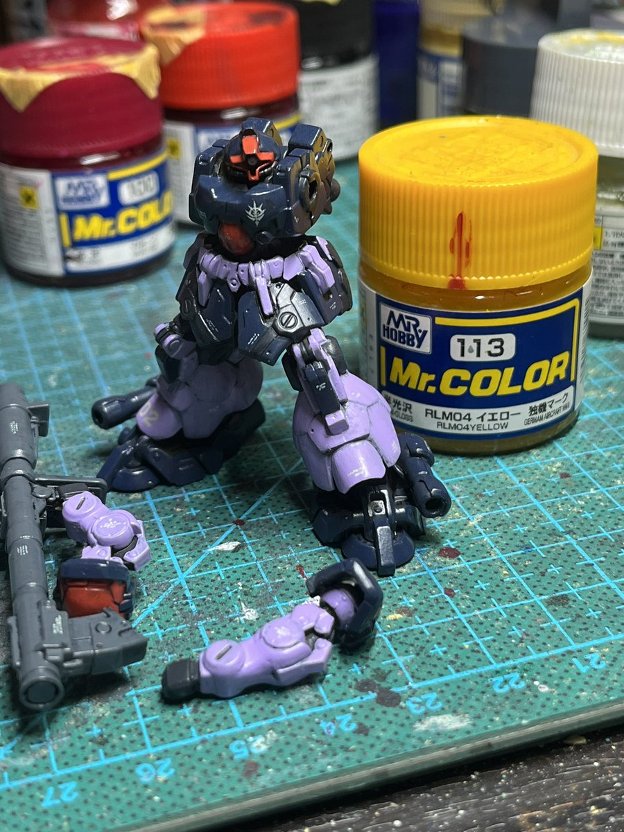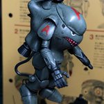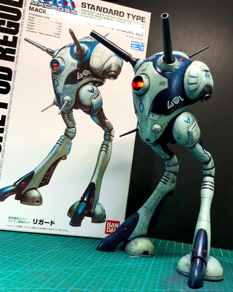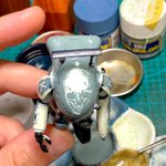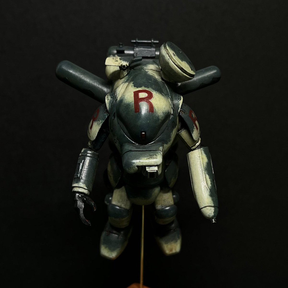 スネークアイ、完成しました! いぶし銀なグレー単色シャークマウス。マークは全てラッカー塗料で手描きしてます。 赤いA、ちょっと彩度が高すぎたかなぁ。もう少しくすむと思ったのだけれども。🤔 机の上がガチャーネンだらけになってきました💧 #マシーネンクリーガー