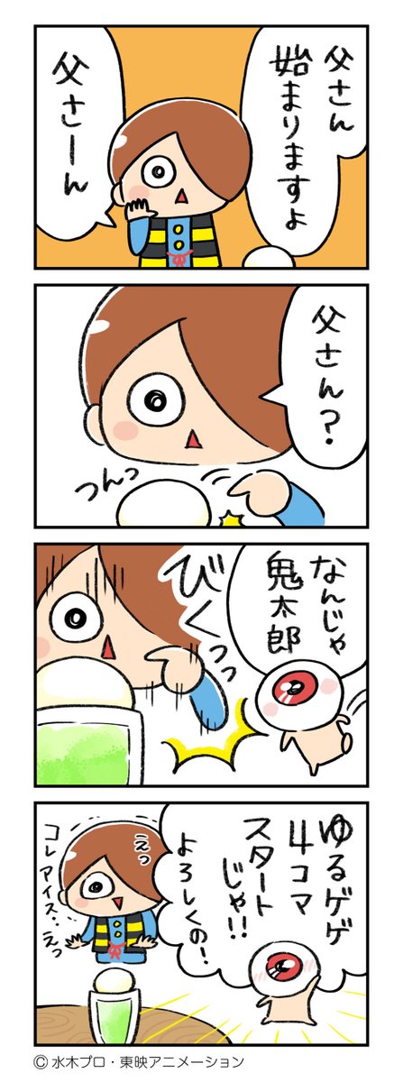 【#ゆるゲゲ4コマ劇場】 父さんにもそんな時代があったんですね。 『昔々の目玉おやじ』 皆さん!期間限定で若かりし頃のおやじさんの姿を、アプリゲーム「ゆる~いゲゲゲの鬼太郎 妖怪ドタバタ大戦争」と「東映ミュージアムチャンネル」にて見ることができますよ~! #ゲゲゲの鬼太郎 #ゆるゲゲ