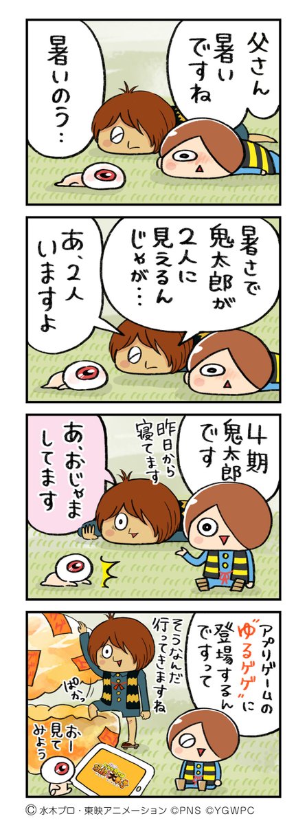 【#ゆるゲゲ4コマ劇場】 前にも似たようなことがあったような…。 『似たりよったり!』 目玉おやじは相変わらず色々なものに間違えられますね~! 現在ゆる鬼太郎(4期)はゆる~く、アプリゲーム「ゆる~いゲゲゲの鬼太郎 妖怪ドタバタ大戦争」に登場中です! #ゲゲゲの鬼太郎 #ゆるゲゲ