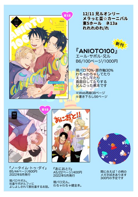 12/11 兄ルオンリー メラ盃お品書き よろしくお願いします 新刊兄ル pixiv.net/artworks/10347… 既刊サボル pixiv.net/artworks/10062… 既刊兄ル pixiv.net/artworks/98926…