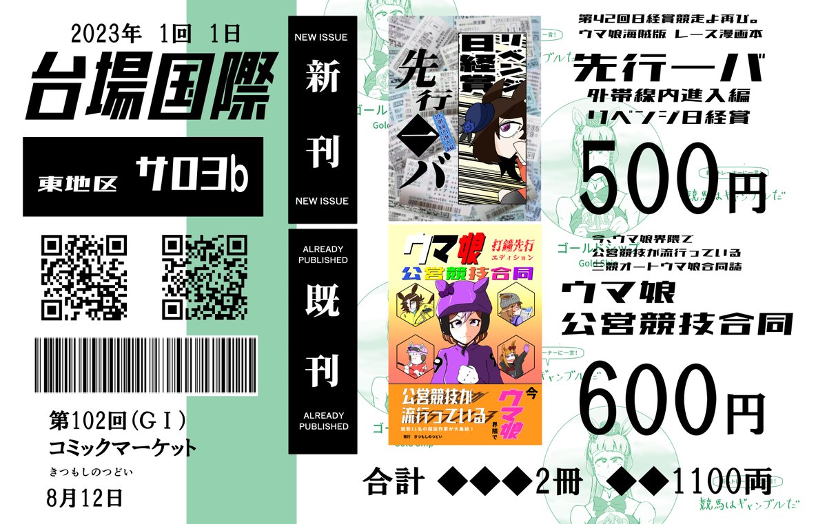C102夏コミのお品書きです! ライスシャワーが日経賞競走で奮闘するレース漫画を頒布致します! ウマ娘公営競技合同も再頒布予定!! 皆様、東3地区サ03bでお会い致しましょう!! webcatalog.circle.ms/Circle/17308108 #C102お品書き
