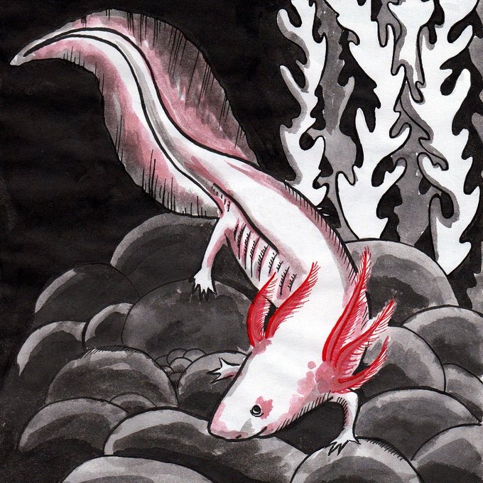 Axolotls are unusual among amphibians in that they reach adulthood without undergoing metamorphosis. Instead of developing lungs and taking to the land, adults remain aquatic and gilled. #kitsunesmile #kitsuneart #inktober #inktober2019 #axolotl #amphibian #fauna