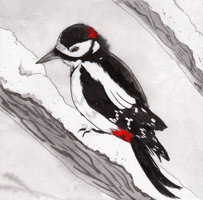 Day 36 Dendrocopos is a widespread genus of woodpeckers, it has a marvellous bright red hat and also pants! #inktober2019 #inktober #kitsunesmile #kitsuneart #inkwash #inkillustration #animalillustration #birds #woodpecker #dendrocopos #wildbirds #улыбкакицунэ #инктобер #дятел