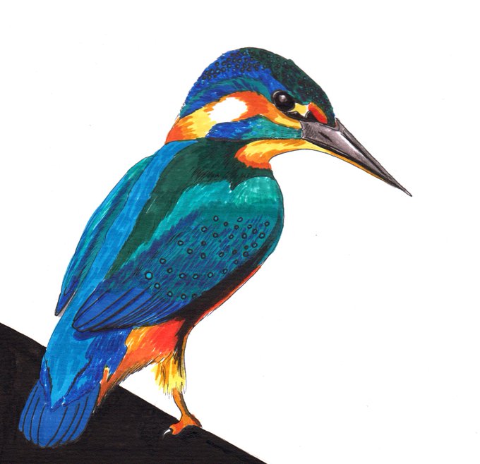 The common kingfisher has a black-and-white relative, pied kingfisher, which would be much more appropriate for #inktober. But I'm still having fun with my markers, so here we are #inktober2019 #kitsunesmile #animalillustration #birds #kingfisher #commonkingfisher #Alcedoatthis