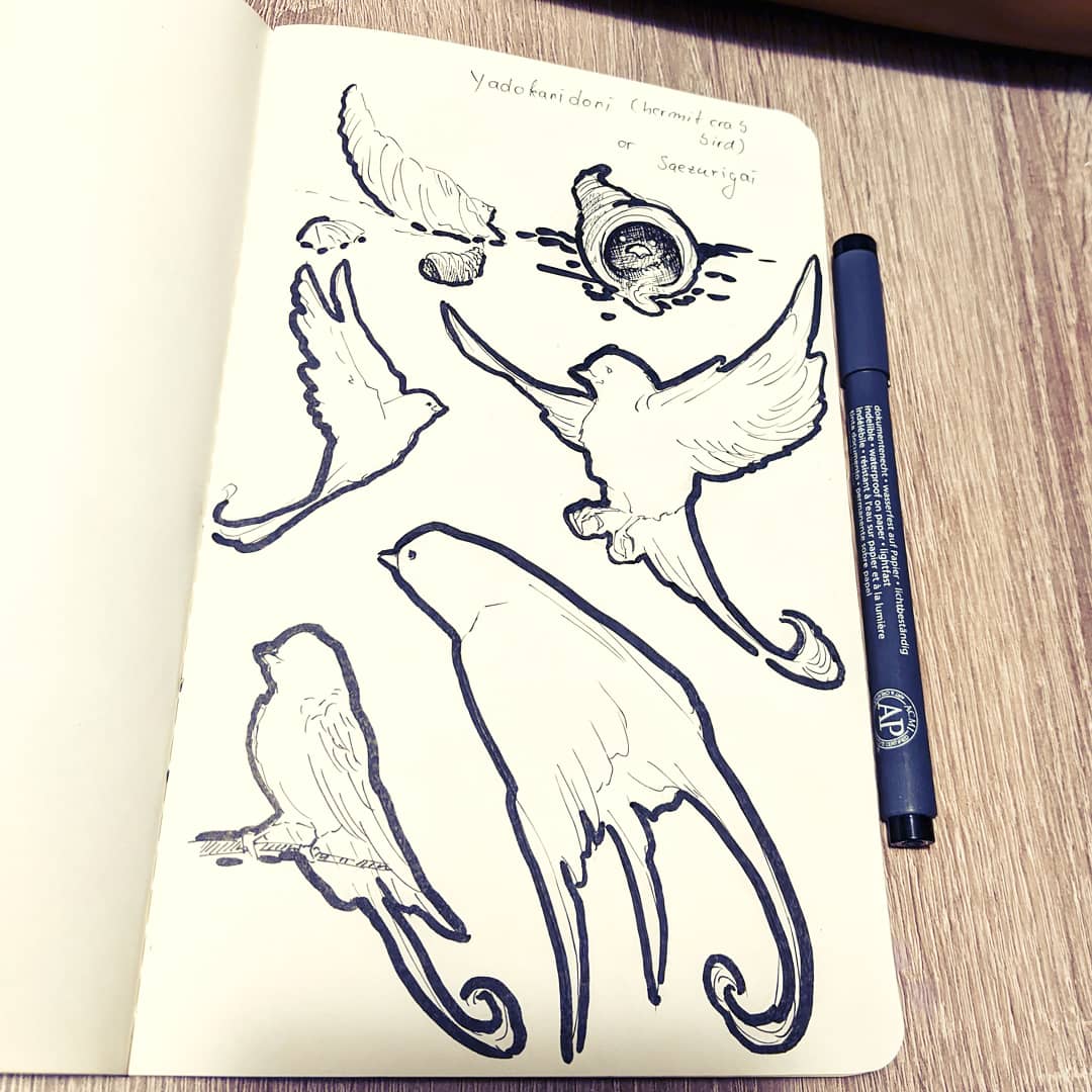 Next one is Yadokaridori (hermit crab). Purely white and with a curled tail. When sense fear, they hide away inside small shells on the shore while chirping to warn their brethren. Their chirping foreshadows a tragedy that is about to happen. #inktober2020 #Inktober #inked