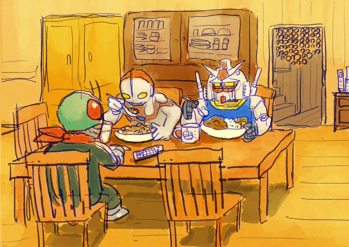 配信テストの練習の会にお越しいただきまして誠にありがとうございました‼️ ガンダムとウルトラマンと仮面ライダーが実家でカレーを食うラクガキを描きました‼️ 春から配信テストの練習を重ねていって、いずれ配信テストができるように頑張ります‼️ twitter.com/kituneiro73/st…