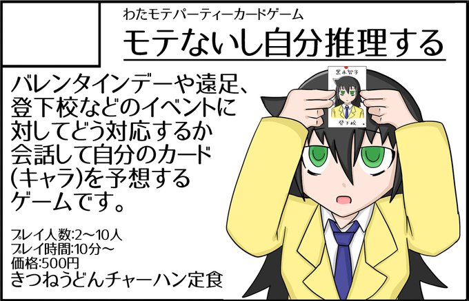 モテ即のサークルカットを差し替えましたので改めて宣伝です。 わたモテがテーマの多人数で遊べるカードゲームを販売予定です。 初参加ではありますがよろしくお願いします。 #モテ即11 #わたモテ