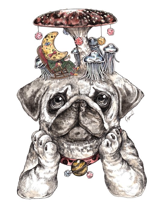 『頭上に謎の生命体が住みついて困るパグ』🐶 #ペン画 #イラスト