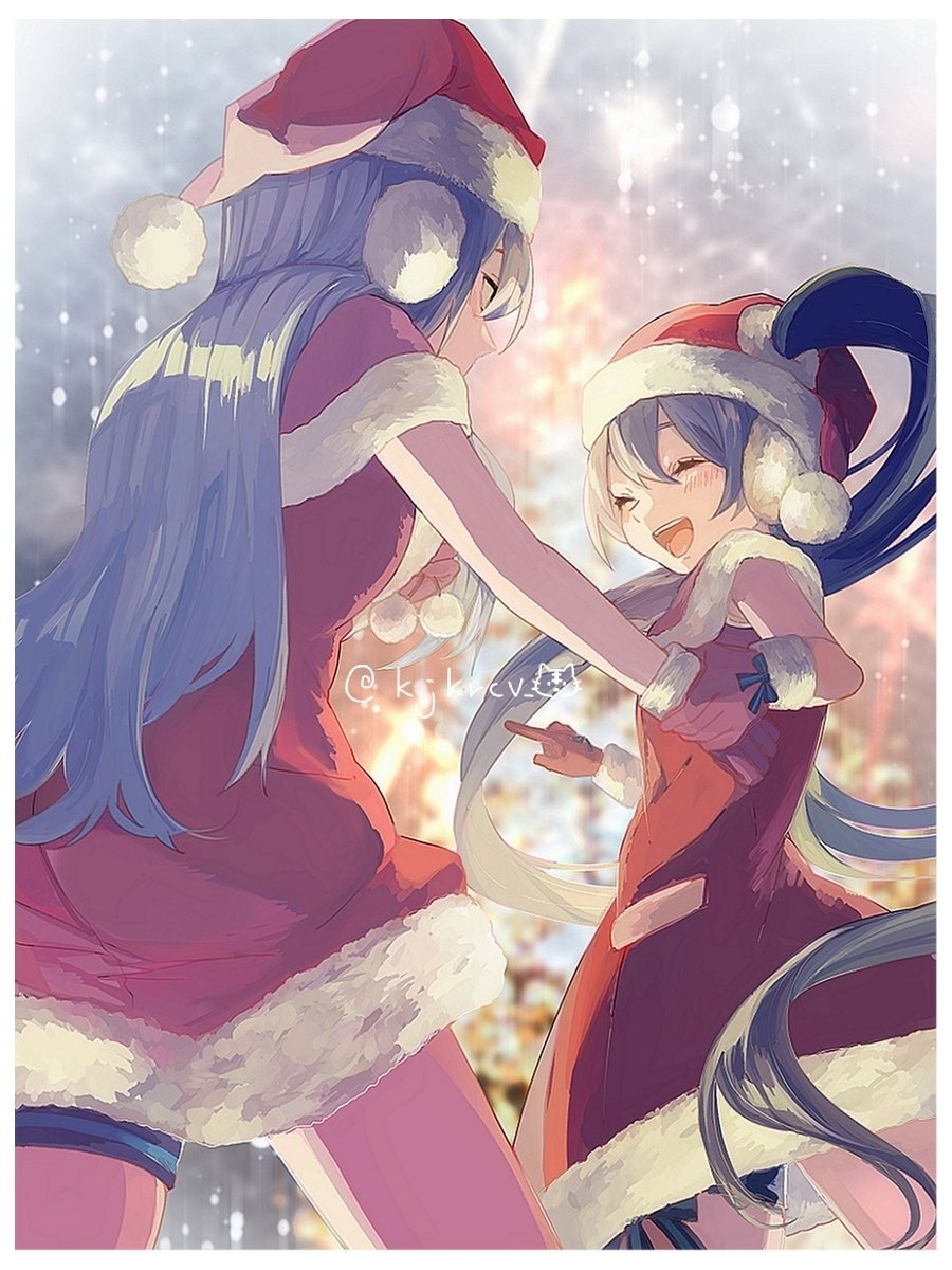 ミクモジュちゃん絵。はいふぃちゃんとリボンガールちゃんと サンタクリスマスちゃんお絵描き。かわいい😊