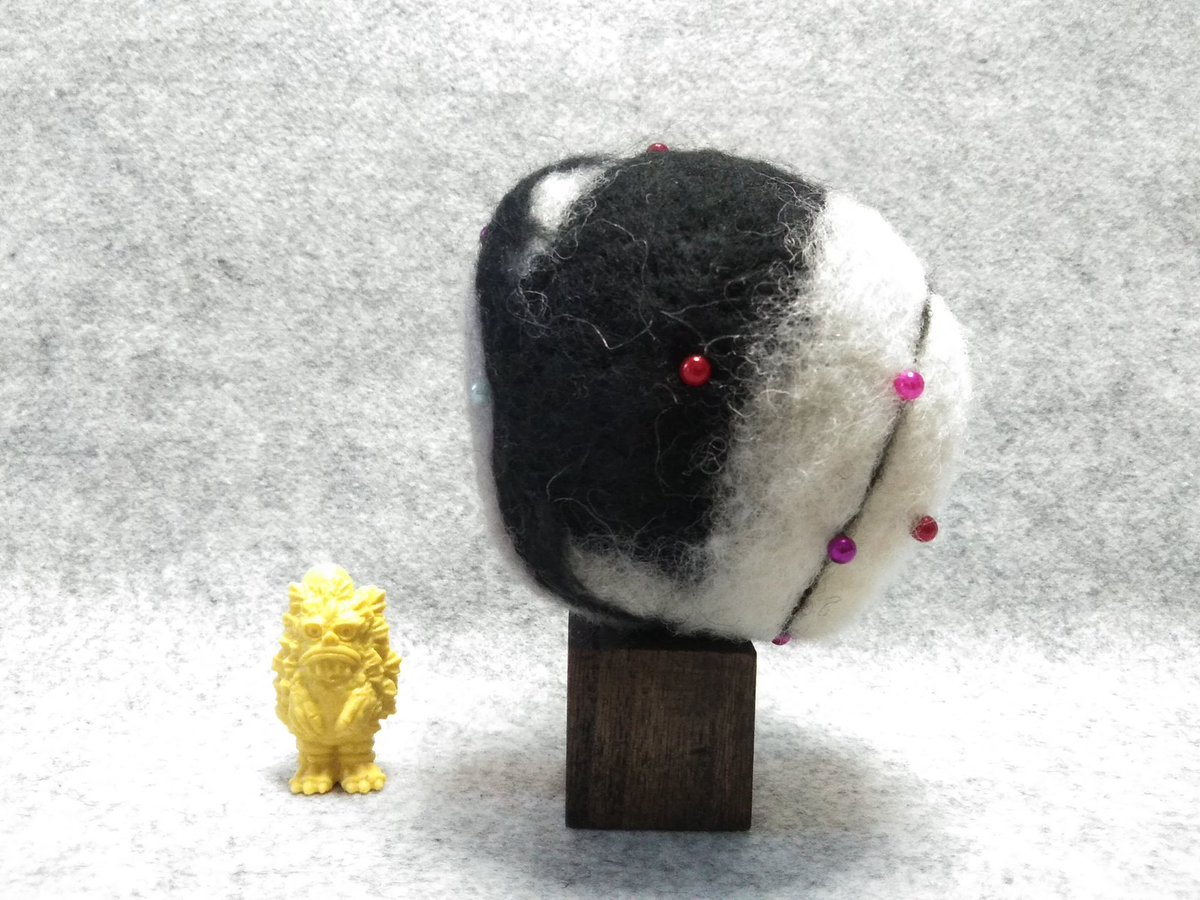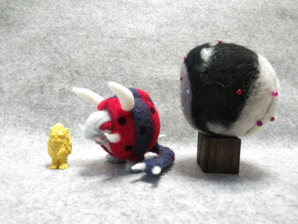 2 32 今週はニセ・セブンさんはお休みして、ブラックエンドおかわり。 おかわりと言っても今回作るのはver.こじこじ。むしろこっちが本番かも。 1枚目はベースの玉。後は作業途中を側面から。一緒に写ってるのは怪獣ケシゴムNEOのピグモンとver.あいりん。 #羊毛フェルト #ウルトラマンレオ #もこもこ怪獣 22/10/20 18:10