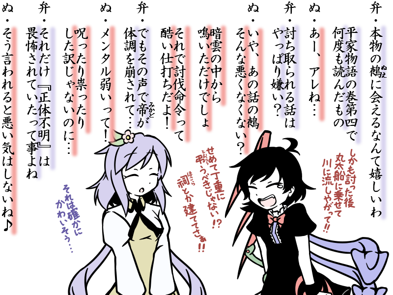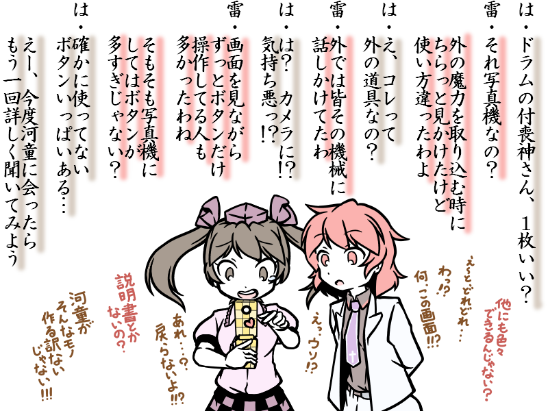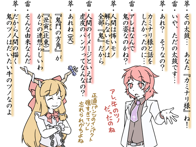 #軽い気持ちで描いたら思った以上に反響があった絵 ニコニコ静画でなぜか閲覧数が爆伸びした井戸端譚[51]の萃香×雷鼓 今日現在で閲覧数3452回 次点である井戸端譚[1]を2倍以上の大差でぶっちぎってます やっぱりパンツの話だからか…?