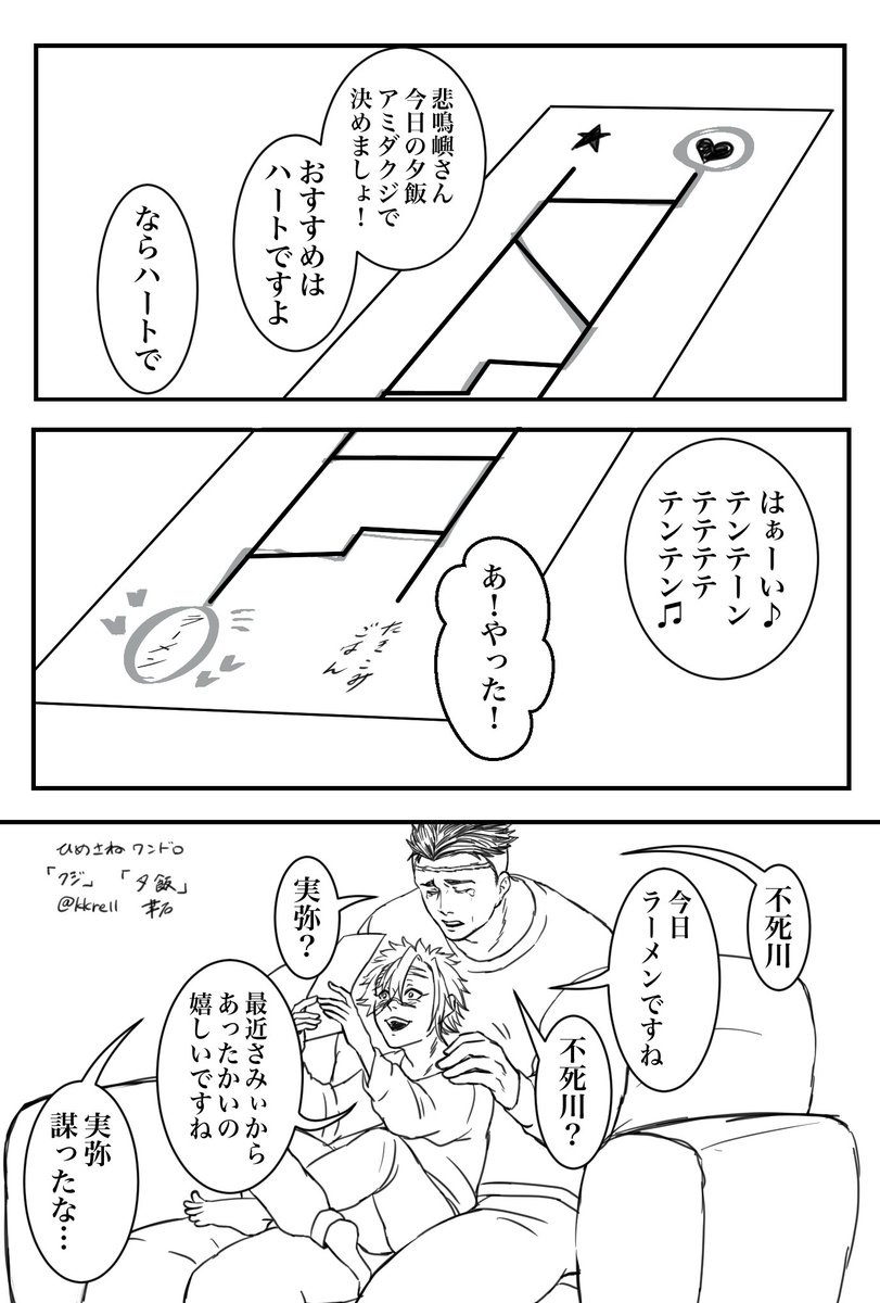 #ひめさね版深夜のワンドロ 今回描く気力あったのとネタができたので描きました!お題「くじ」「夕ご飯」1時間でできました!ネタ被り等あったらすいません💦