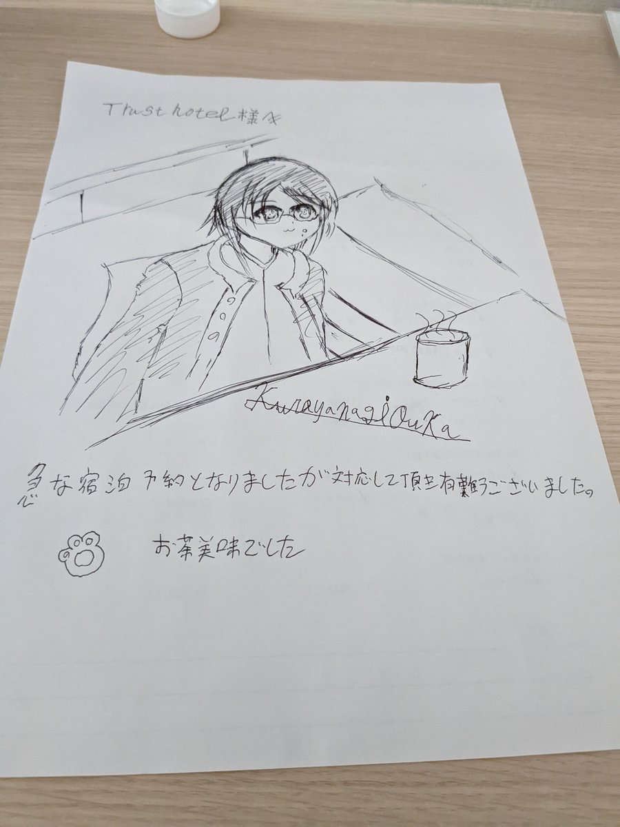 0 4 急な宿泊予定でしたがホテル側さんの御礼としてアンケート用紙の裏側にイラスト記入。 #アンケート用紙 #ホテル #イラスト 22/10/08 09:26