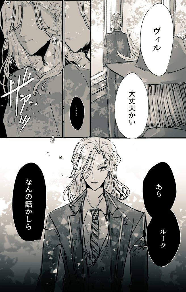 #ルクヴィル #twst_BL 🏹「おや?ここ数日、君の瞳を濡らしているその理由は私には教えてくれないのかい?」 👑「…バカね。こういう時は見ないフリするものでしょ。」 5章後のルクハン…前にも増してヴィ様のメンタルケアしてきそう。