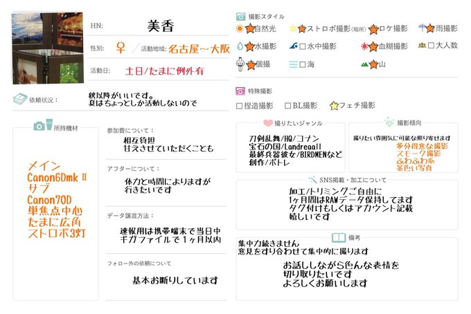関西在住、名古屋~大阪で活動してます📸 RT中心に♡もお迎えにいかせてください💫 色んな撮影に挑戦してみたいです! 特にSD🏀撮影ご一緒してくださる方探してます!!! #カメラマンプロフ #レイヤーさんと繋がりたい #カメラマンさんと繋がりたい
