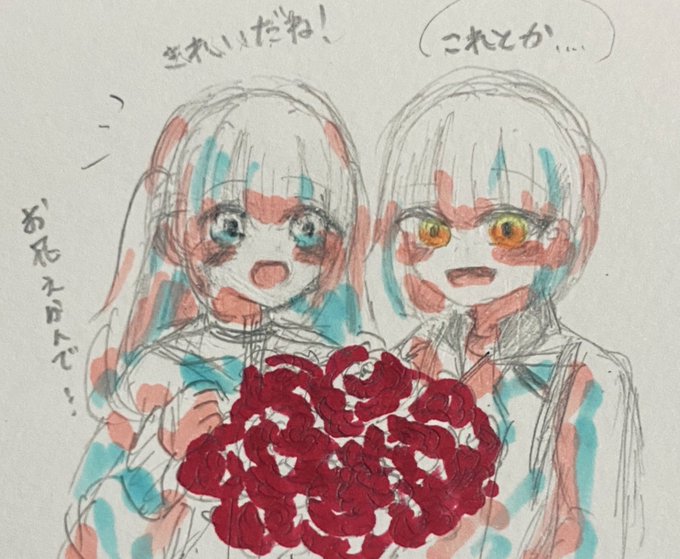 3 5 スズエナ〜!!!妄想らくがき 双子ちゃんでお花見に行って一緒に母の日のプレゼント考えてたらいいな………。スズメしっかり計画立ててそう…! #トワツガイ_FA 23/05/15 01:37