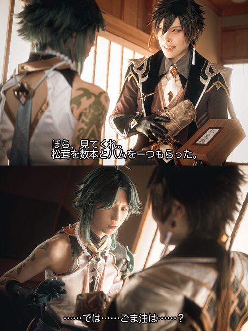 10 33 【⚠︎/cos/コスプレ/原神】 - 海灯祭エピローグ - 「祭りのためにごま油を購入するよう、堂主から言いつけられている。」 魈/さやり(@_sayari_ ) 鍾離/鷹宮 photo/シキ(@slki_0701xx ) 23/03/13 20:02