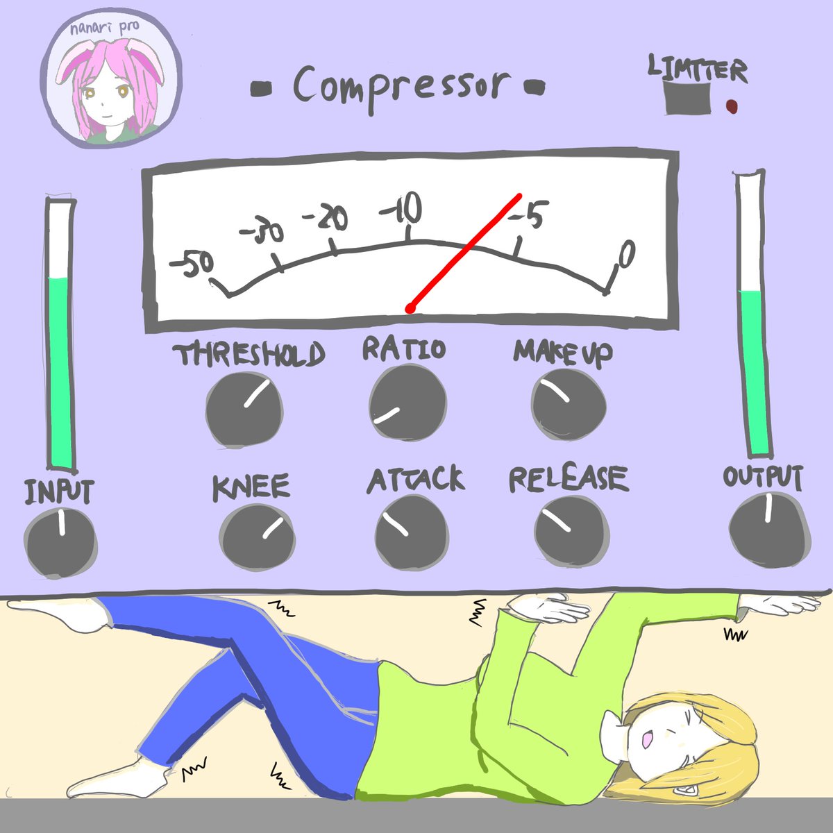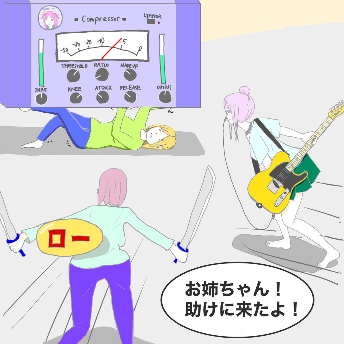 ななりさん(@nanari_musica)からのリクエストで描かせていただきました!ありがとうございます! ========= 助けて!コンプレッサーに潰されそうなの! #DTMネタイラスト #イラスト