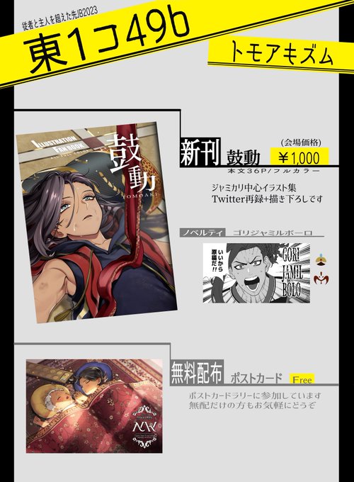 6/25 東1コ49b トモアキズム ■新刊 ¥1,000(会場価格) 本文36Pフルカラーイラスト本(Twitter再録+描きおろし2枚) ノベルティ:ゴリジャミルボーロ ポスカラリー用のポスカもあります 普段全然ツイッター見れてないので当日はおしゃべりしてもらえると嬉しい #ジャミカリお品書き_従主230625